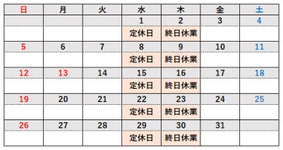 10月は毎週水曜日の定休日に加えて、毎週木曜日は休業させていただきます。