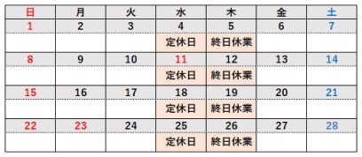 2月は毎週水曜日の定休日に加えて、毎週木曜日は休業させていただきます。